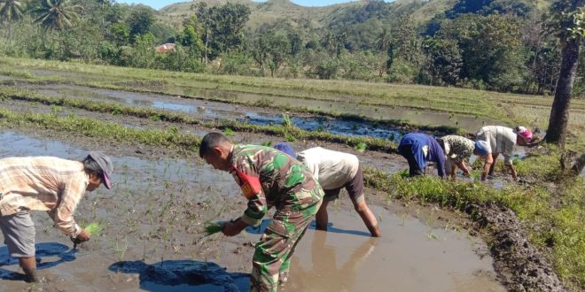 SUMBA TIMUR DESA NUSANTARA Anggota TNI dari Koramil 04/Tabundung, Kodim 1601/Sumba Timur, Kopka Yupiter Babis, kembali menunjukkan dedikasinya terhadap sektor pertanian. Ia turun langsung ke sawah membantu para petani menanam padi diĀ Desa Persiapan Prekomba, Kecamatan Tabundung, Kabupaten Sumba Timur, Sabtu (04/10/2025).