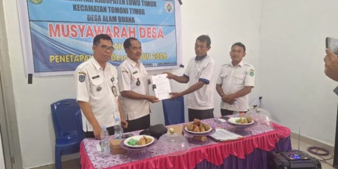 LUWU TIMUR DESA NUSANTARA Desa Alam Buana di Kecamatan Tomoni Timur, Kabupaten Luwu Timur, resmi menutup rangkaian Musyawarah Desa (Musdes) untuk pembahasan dan penetapan Rencana Kerja Pemerintah Desa (RKPDes) tahun 2026 serta penetapan Daftar Usulan Kegiatan (DUK) tahun anggaran 2027. Desa ini menjadi yang terakhir dari delapan desa di wilayah tersebut yang menyelesaikan proses musyawarah perencanaan pembangunan.