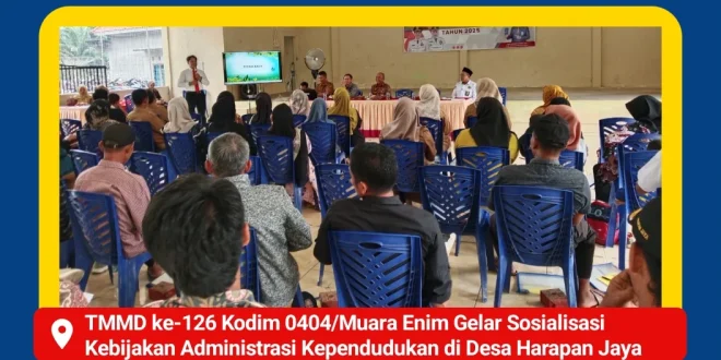 MUARA ENIM DESA NUSANTARA Dalam rangka mendukung program Tentara Manunggal Membangun Desa (TMMD) ke-126, Kodim 0404/Muara Enim menggelar sosialisasi kebijakan administrasi kependudukan dan catatan sipil di Desa Harapan Jaya, Kecamatan Muara Enim, Kabupaten Muara Enim, pada Selasa (28/10/2025).