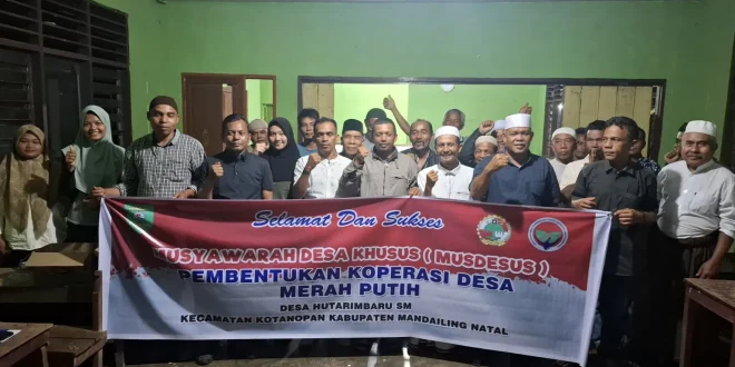 MENDAILING NATAL DESA NUSANTARA Dalam upaya memperkuat ekonomi masyarakat desa, Darwin Nasution terpilih sebagai Ketua Koperasi Merah Putih Desa Hutarimbaru-SM, Kecamatan Kotanopan, Kabupaten Mandailing Natal, melalui Musyawarah Desa Khusus (Musdesus) yang digelar di Gedung Madrasah Mardiyah, pada Jumat (09/05/2025) malam.