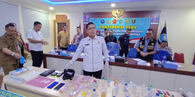 BARANG BUKTI NARKOTIKA - Kepala BNNP Lampung Kombes Pol Sakeus Ginting saat menunjukkan barang bukti narkotika dan isap bong dalam konpers, Selasa (11/11/2025).