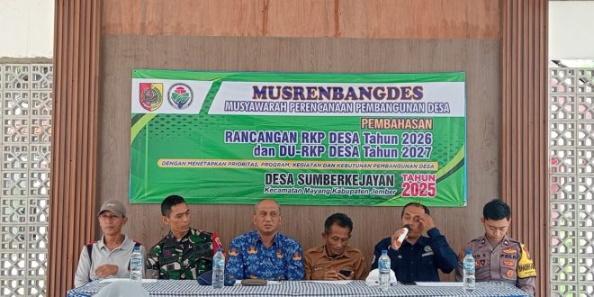JEMBER DESA NUSANTARA Pemerintah Desa Sumberkejayan, Kecamatan Mayang, Kabupaten Jember, menggelar Musyawarah Perencanaan Pembangunan Desa (Musrenbangdes) sebagai langkah strategis dalam merumuskan Rencana Kerja Pemerintah (RKP) Desa Tahun 2025 serta Daftar Usulan RKP (DU-RKP) Tahun 2027. Kegiatan tersebut berlangsung di Balai Desa Sumberkejayan dengan melibatkan berbagai unsur masyarakat dan lembaga desa.