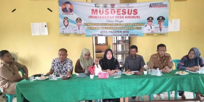 MESUJI BARAT DESA NUSANTARA Badan Permusyawaratan Desa (BPD) Harapan Jaya, Kecamatan Simpang Pematang, Kabupaten Mesuji menggelar Musyawarah Desa Khusus (Musdesus) yang membahas penguatan pembiayaan bagi Koperasi Desa Merah Putih. Kegiatan berlangsung di Balai Desa Harapan Jaya dan dihadiri unsur BPD, perangkat desa, masyarakat, Kepala Desa Harapan Jaya, Sekretaris Camat Simpang Pematang, serta Koordinator Cabang Kabupaten Mesuji.