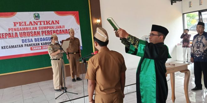 BEDAGUNG DESA NUSANTARA Pemerintah Desa Bedagung, Kecamatan Panekan, memperkuat struktur organisasinya dengan melantik Kristal Joko Prasetyo sebagai Kepala Urusan (Kaur) Perencanaan. Prosesi pelantikan dan pengambilan sumpah jabatan berlangsung di Balai Desa Bedagung, Jumat (21/11/2025).