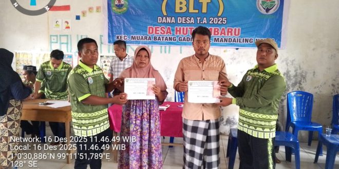 BATANG, DESA – NUSANTARA: Pemerintah Desa Hutaimbaru, Kecamatan Muara Batang Gadis, melaksanakan penyaluran Bantuan Langsung Tunai (BLT) Dana Desa (DD) Tahap 3 dan 4 Tahun 2025 kepada 43 Kepala Keluarga (KK). Penyaluran bantuan tersebut berlangsung di Balai Desa Hutaimbaru sekitar pukul 09.00 WIB.
