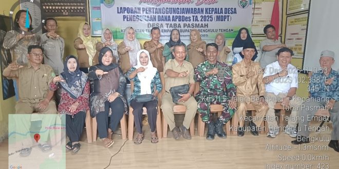 BENTENG, DESA – NUSANTARA: Pemerintah Desa Taba Pasmah, Kecamatan Talang Empat, menggelar Musyawarah Desa Pertanggungjawaban Tahunan (MDPT) dalam rangka penyampaian laporan pertanggungjawaban Kepala Desa atas penggunaan Anggaran Pendapatan dan Belanja Desa (APBDes) Tahun Anggaran 2025, pada Senin (22/12/2025).