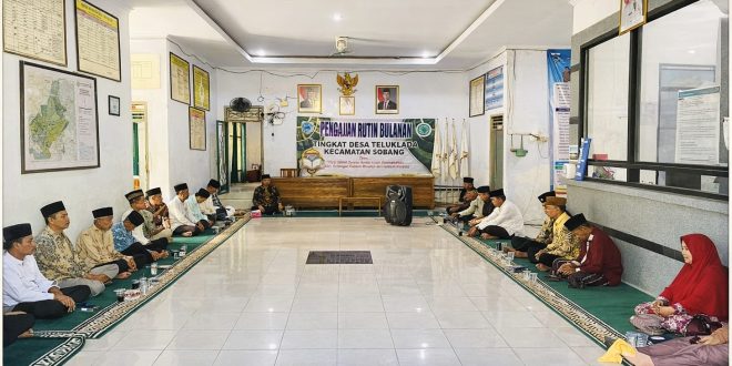 PANDEGLANG, DESA – NUSANTARA: Pemerintah Desa Teluklada, Kecamatan Sobang, Kabupaten Pandeglang menggelar pengajian rutin bulanan tingkat desa dengan suasana khidmat. Kegiatan tersebut mengangkat tema “Ngaji adalah sarana ibadah untuk meningkatkan kualitas hubungan habluminallah dan habluminannas.”