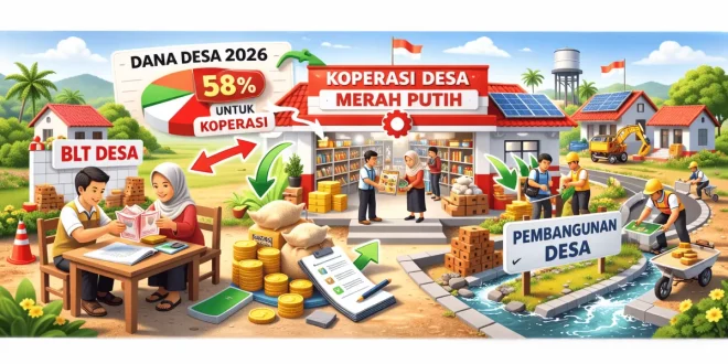 JAKARTA, DESA – NUSANTARA: Kebijakan pengalokasian 58,03 persen Dana Desa tahun anggaran 2026 untuk Koperasi Desa Merah Putih (KDMP) memunculkan pertanyaan mengenai keberlanjutan program bantuan langsung tunai (BLT) desa dan pembangunan infrastruktur di tingkat desa.
