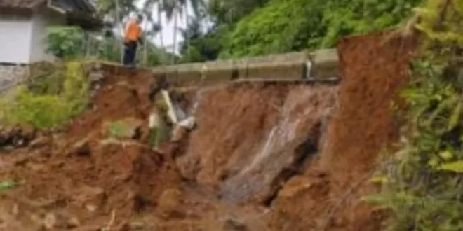 CIAMIS, DESA – NUSANTARA: Tebing penahan tanah (TPT) di area kolam ikan milik Kelompok Tani Ikan Rukun Tetangga, Desa Mekarjaya, Kecamatan Baregbeg, Kabupaten Ciamis, longsor sekitar pukul 16.30 WIB. Untungnya, tidak ada korban jiwa dalam peristiwa tersebut.