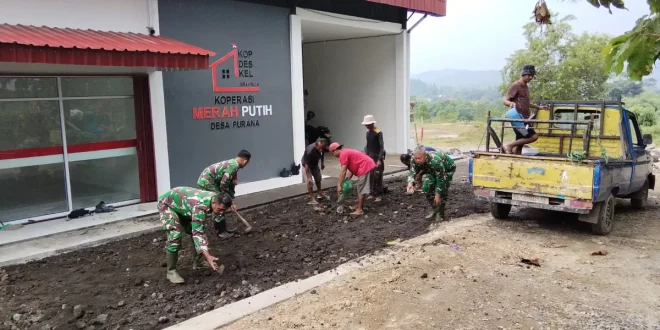 TNI dan Warga Purana Gotong Royong Tata Halaman Koperasi Desa