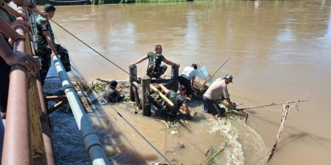 “Hari ini kami bersama warga kembali lakukan pembersihan sampah-sampah yang tersangkut di tiang jembatan,” ujar Danramil.