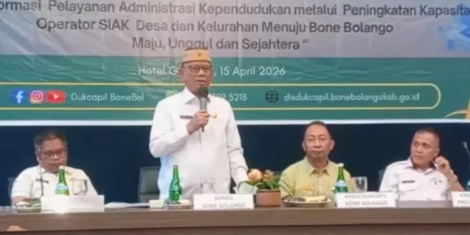 Sebanyak 165 operator dari 160 desa dan lima kelurahan mengikuti Bimbingan Teknis (Bimtek) yang diselenggarakan Dinas Kependudukan dan Pencatatan Sipil (Disdukcapil) Bone Bolango di Grand Q Hotel Gorontalo, Rabu (15/4/2026). Program ini menjadi langkah strategis dalam memperkuat peran desa sebagai garda terdepan pelayanan administrasi.