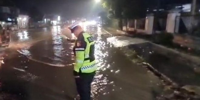 Aparat dari Satuan Lalu Lintas (Satlantas) Kepolisian Resor (Polres) Pasuruan Kota tampak berjaga di sejumlah titik rawan genangan. Kendaraan roda empat atau lebih diarahkan untuk menggunakan jalan tol guna menghindari kemacetan.