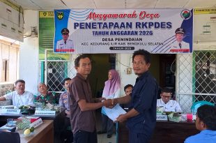 BENGKULU DESA NUSANTARA Setelah menuntaskan program penggemukan sapi sebagai prioritas pembangunan selama tahun 2025, Pemerintah Desa Penindaian, Kecamatan Kedurang Ilir, menetapkan arah baru pembangunan pada tahun 2026. Fokus utama yang diusung adalah pemberdayaan masyarakat sebagai strategi memperkuat ekonomi dan kapasitas warga desa. Kebijakan ini disepakati dalam Musyawarah Desa Penetapan Rencana …