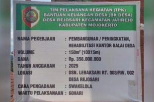MOJOKERTO, DESA – NUSANTARA: Pemerintah Desa Rejosari, Kecamatan Jatirejo, Kabupaten Mojokerto, melalui Tim Pelaksana Kegiatan (TPK) merealisasikan pembangunan, peningkatan, serta rehabilitasi Kantor Balai Desa Rejosari dengan baik dan sesuai Rencana Anggaran Pelaksanaan (RAP). Kegiatan tersebut bersumber dari Bantuan Keuangan Desa (BK Desa) Tahun Anggaran 2025. Kepala Desa Rejosari, Suprapto, menyampaikan …