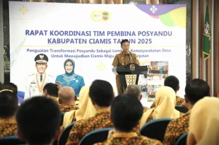 CIAMIS DESA NUSANTARA Bupati Ciamis Herdiat Sunarya menegaskan bahwa Posyandu merupakan ujung tombak pelayanan masyarakat di tingkat desa. Hal tersebut disampaikannya saat membuka Rapat Koordinasi (Rakor) Tim Pembina Posyandu Kabupaten Ciamis Tahun 2025 yang digelar di Aula PKK Ciamis, pada Senin (13/10/2025). Rakor tersebut mengusung tema “Penguatan Transformasi Posyandu sebagai Lembaga Kemasyarakatan Desa untuk Mewujudkan Ciamis Maju …
