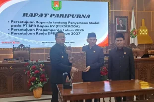 MAGELANG DESA NUSANTARA Dewan Perwakilan Rakyat Daerah (DPRD) Kabupaten Magelang bersama Pemerintah Kabupaten (Pemkab) Magelang menyetujui tiga poin penting dalam rapat paripurna yang digelar di Gedung DPRD Kabupaten Magelang. Tiga kesepakatan tersebut meliputi Rancangan Peraturan Daerah (Raperda) tentang Penyertaan Modal pada PT BPR Bank Bapas 69 (Perseroda), Program Pembentukan Peraturan …